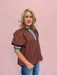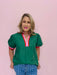 The Elonore Blouse showcases a sophisticated solid short bubble sleeve design with a distinctive multicolor band finish. Crafted from lightweight woven fabric, it offers a semi-sheer, unlined construction that balances elegance with breathability. Ideal for layering or wearing alone, this blouse combines refined style with comfortable wearability.