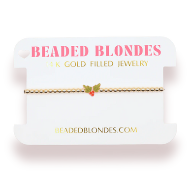 Part of the Beaded Blondes Holiday Collection. Our Holly Bracelet is on gold making it perfect to add to your stack for the holidays. 3MM gold be...