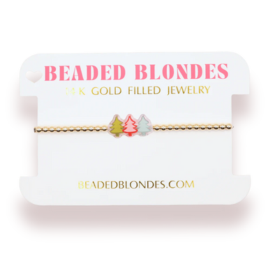 Part of the Beaded Blondes Holiday Collection. Our Tree Trio Holiday Bracelet is on gold making it perfect to add to your stack for the holidays. ...