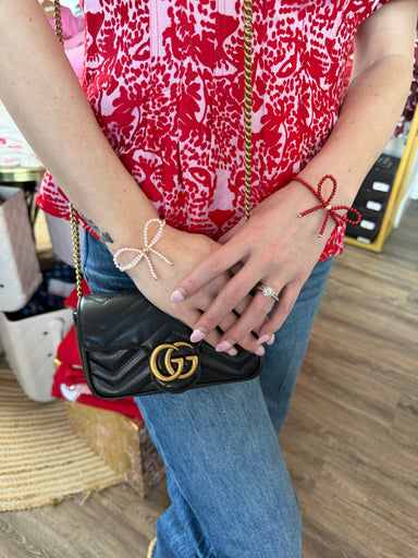 Tie one on with this charming red pearl beaded bow bracelet! Delicate pearl beads are strung together and finished with an adorable bow detail that...