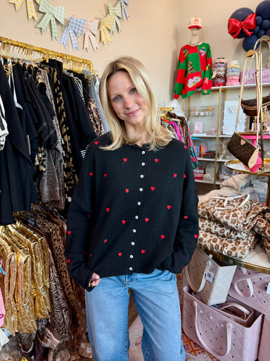 This button-down knit cardigan features a charming pattern of red hearts, combining classic comfort with a playful touch. Crafted for warmth and st...
