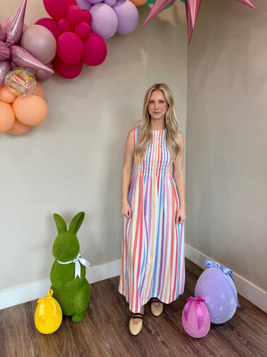 Effortless elegance meets vibrant style with the Claire Multi Color Stripe Midi Dress. This versatile piece features bold, eye-catching stripes in ...