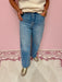 Ankle-high rise bowed leg jeans in medium denim color made from cotton feature a flattering high waist that elongates the legs and a distinctive bowed or curved leg silhouette for a vintage-inspired, stylish look. The medium denim hue provides versatile, classic appeal, while the cotton fabric ensures comfort, breathability, and durability. These jeans are perfect for pairing with casual tops or blouses, offering a chic and timeless addition to any wardrobe.