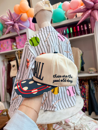 Classic navy canvas baseball cap featuring charming white polka dots for a timeless, playful look. The structured six-panel design offers comfortab...
