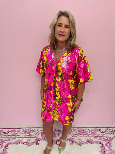 Be the star of the night in our Leighton Midi Sequin Dress. Its loose silhouette, two slits, and intricate sequined floral pattern will make you st...