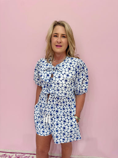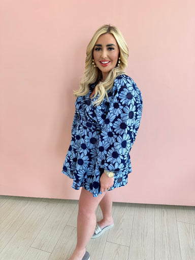The Palm Springs romper features a striking blue sunflower pattern that combines sophistication with playful design elements. Crafted with precisio...