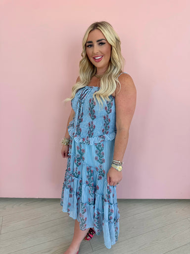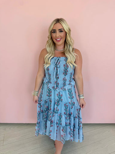 The Alejandra Midi Dress features a delicate blue floral pattern that brings a fresh, elegant touch to your wardrobe. Its midi length offers a vers...