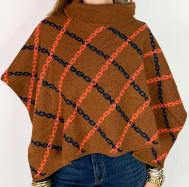 Wrap yourself in cozy charm with the Patty Knit Poncho in a playful brown chain print. This versatile piece adds a touch of fun and warmth to any o...