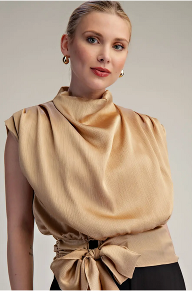 The Lisa Blouse features an elegant high draped neckline that frames the shoulders beautifully, paired with a sleeveless silhouette for effortless ...