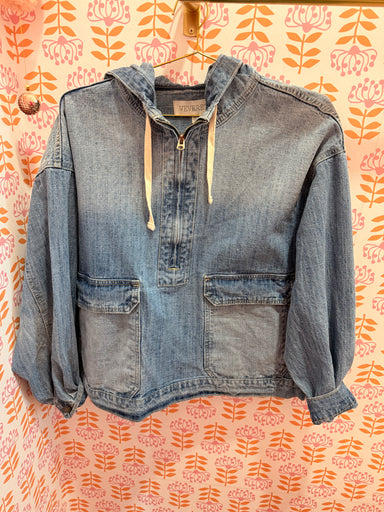 Layer up with our Hooded Quarter Zip Denim Jacket—where classic denim meets modern comfort. The cozy hood keeps you covered while the quarter zip l...