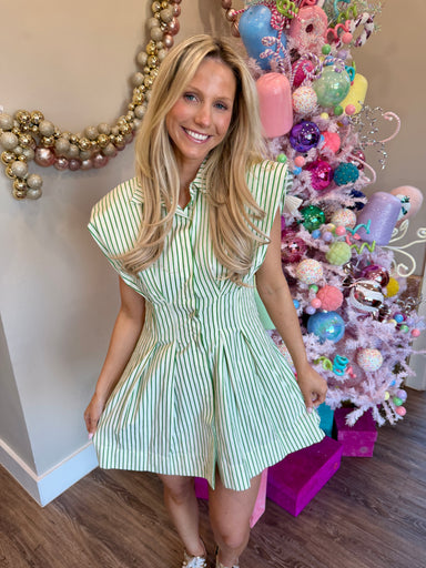 The Georgia Dress features a timeless striped pattern with a crisp collar and sleeveless design, offering a refined silhouette perfect for warm wea...