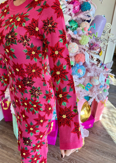 Celebrate the season in style with this Pink & Red Poinsettia Knit Midi Dressโyour perfect holiday statement! Adorned with shimmering sequins a...