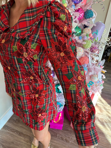 Red Plaid Poinsettia Oversized Collar Poof Sleeve Dress - Queen Of Sparkles