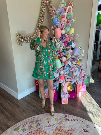 Step into holiday magic with the Green Nutcracker & Candy Cane Cotton Poof Sleeve Button Up Dress. Featuring whimsical poof sleeves and a festi...
