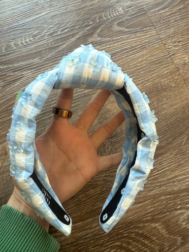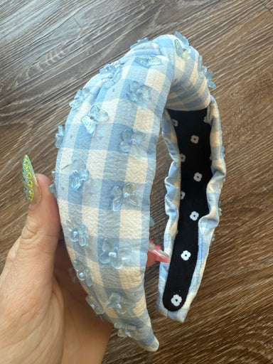 Elevate your accessory collection with the Butterfly Blue Gingham Headband, featuring a classic blue gingham pattern adorned with delicate floral a...