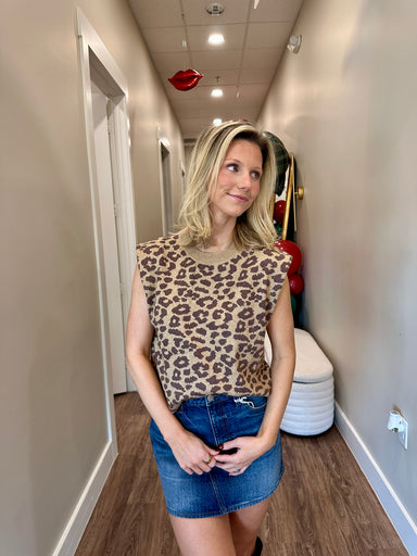 The Leia Leopard Sleeveless Sweater from ee:some is a stylish and versatile piece crafted from a blend of 50% viscose, 30% polyester, and 20% nylon...
