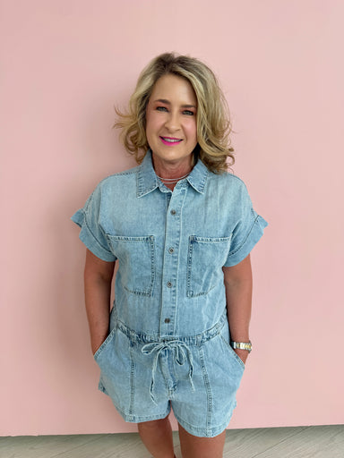 Get ready for summer with the Topanga Romper! This denim short sleeve romper features a convenient button down design, making it the perfect combin...
