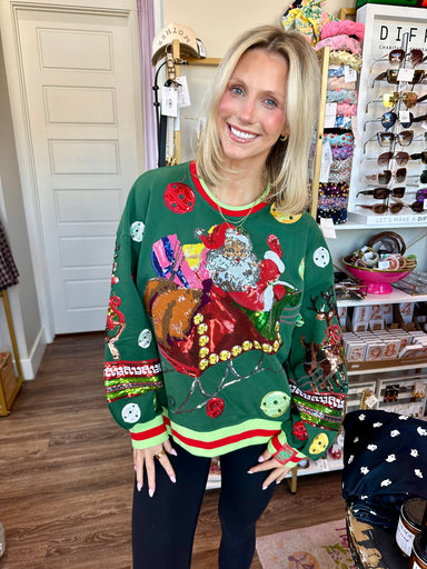 Dark Green Vintage Jingle Bell Santa Sweatshirt- Queen Of Sparkles