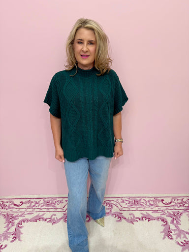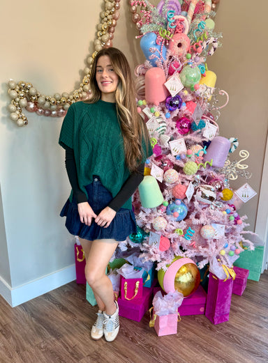 The Claude Cable Knit Sweater by Mud Pie is a charming green long-sleeve sweater featuring a classic cable knit design, offering cozy warmth and ti...