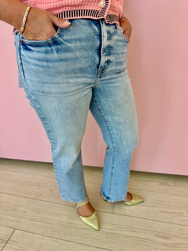 Discover the timeless style of the Straight Up High Rise in Swoon Vintage. With its scissor-cut hem, distressed details, and light blue wash, this ...