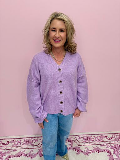 The Cool Of The Night Cardi in Lilac Spell Melange by Free People is an oversized, cozy cardigan that combines a soft lilac hue with a textured mel...