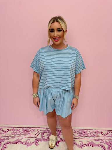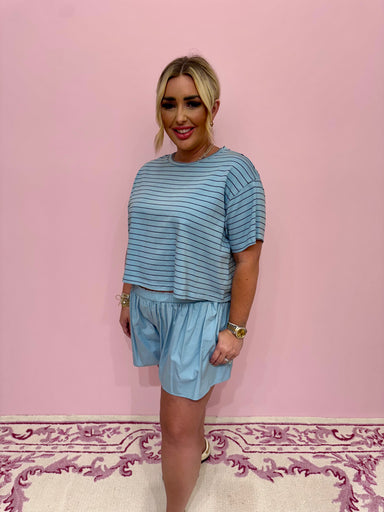 The Sky Set features a blue striped shirt paired with matching blue shorts, creating a coordinated and polished look. Crafted for comfort and style...