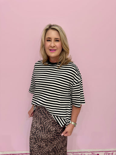 The Max Top in black and white horizontal stripes is a chic and timeless piece that combines classic pattern with contemporary style. Made from c...