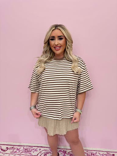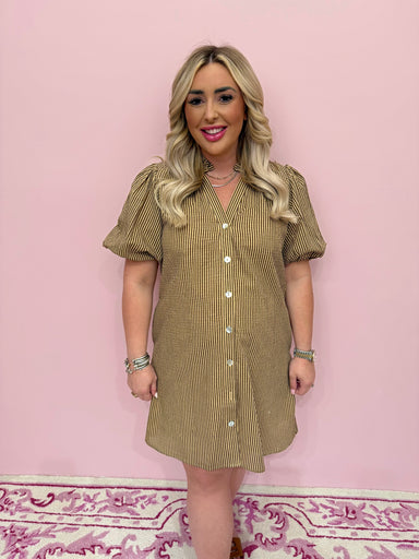 The Clarie Dress is a charming mini dress featuring puff sleeves and a classic brown and white stripe pattern, perfect for a fresh, feminine look...