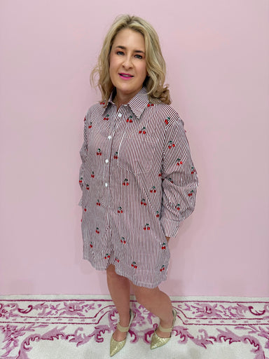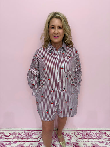 This striped cotton romper combines classic button-up style with long sleeves for versatile comfort. Detailed with jewel-embellished cherry accents...