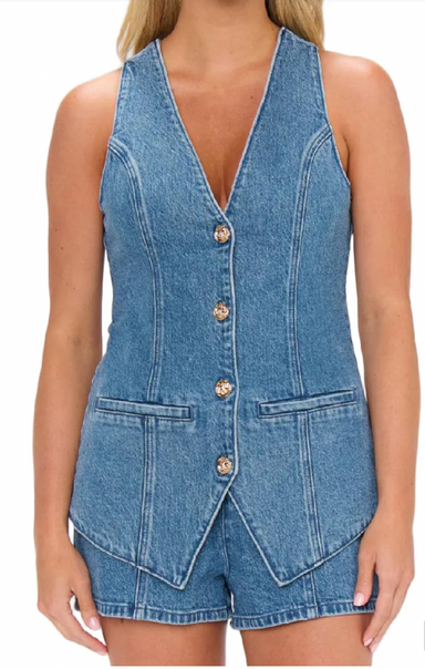 The Stacy Denim Vest by The English Factory is a stylish sleeveless, V-neck vest crafted from dark denim, featuring a classic button-up front with ...