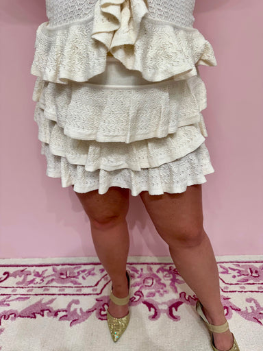 The Marley Skort in Cream Pointelle Knit by Show Me Your Mumu is a chic and cozy piece featuring a soft, breathable pointelle knit fabric with a cl...