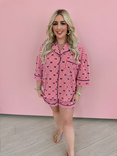 Stay cozy and patriotic in our Patriotic Bow PJ Set! Made with a charming red, white, and blue gingham pattern, this set includes a festive bow for...