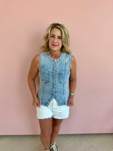 The Gia Vest in denim blue offers a versatile layering piece crafted for both style and durability. Its classic denim fabric ensures long-lasting w...