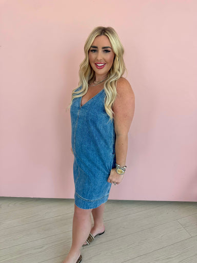 Stay effortlessly stylish with our Tavi Pop Over Dress. This denim v-neck tank top dress features convenient pockets for added functionality. Perfe...
