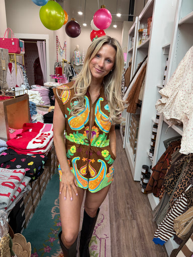 The Brown & Neon Paisley Zip Up Romper features a modern paisley design that merges style with functionality. Its zip-up closure ensures ease o...