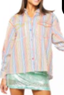Elevate your casual wardrobe with this vibrant rainbow striped button-up top from Queen Of Sparkles. Crafted from soft, breathable cotton, this pie...