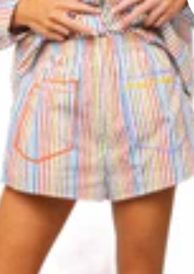 Elevate your casual wardrobe with these vibrant rainbow striped cotton shorts. Featuring practical front pockets and a comfortable fit, they're per...