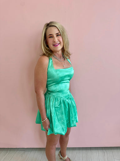 Slip into pure enchantment with the Zelda Mini Dress in shimmering emerald sequins. This playful stunner catches the light from every angle, transf...
