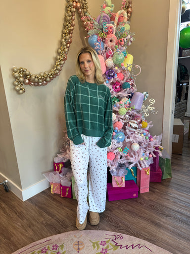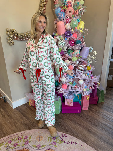 Wrap yourself in festive cheer with these delightful holiday pajama pants featuring whimsical candy cane stripes and charming bow details. Perfect ...