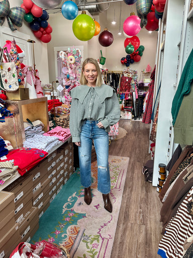 Crisp gingham poplin in hunter green and white creates the perfect canvas for this charming Peter Pan collar top. The structured fabric holds its ...