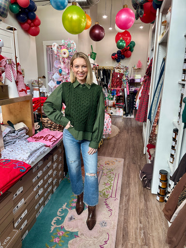Layer up with the Elphie Mixed Media Cable Knit Top in a gorgeous olive green that's equal parts cozy and chic. This playful piece blends classic c...