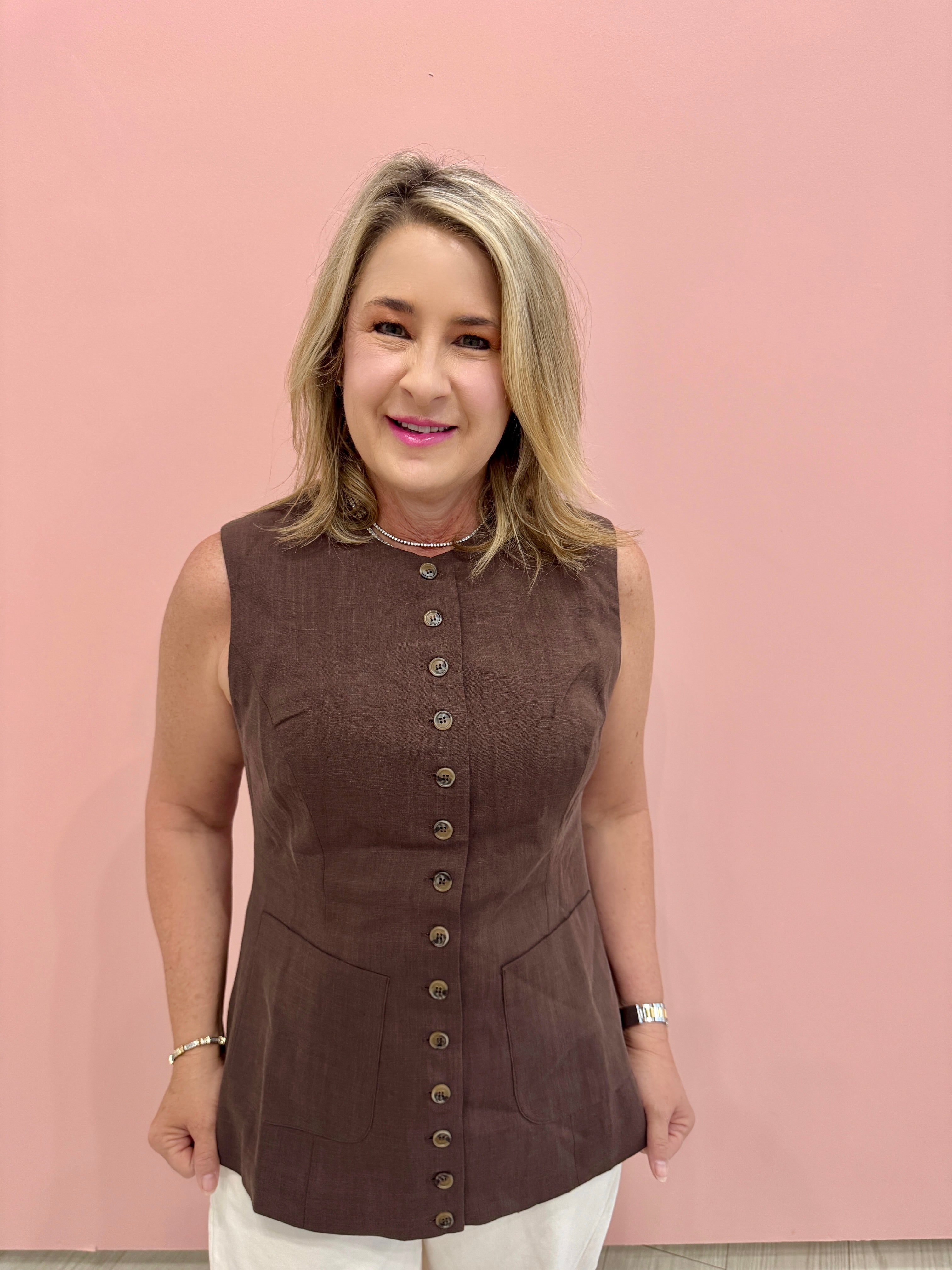 The Josette Vest is a versatile addition to any wardrobe. With its classic brown color and button down design, it offers effortless style and functionality. Expertly crafted, it provides a polished and professional look for any occasion. Made with high-quality materials, it promises to be a durable and long-lasting staple piece.