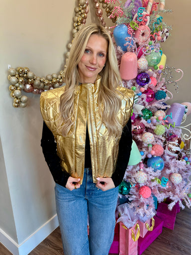 Add a touch of sparkle to your look with the Annie Vest in Gold by Emily McCarthy. This playful piece effortlessly blends chic style and a hint of ...