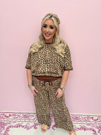 The Wild Knit Set features a striking leopard-print top and matching pants crafted from a soft, knit fabric. This coordinated ensemble offers both ...