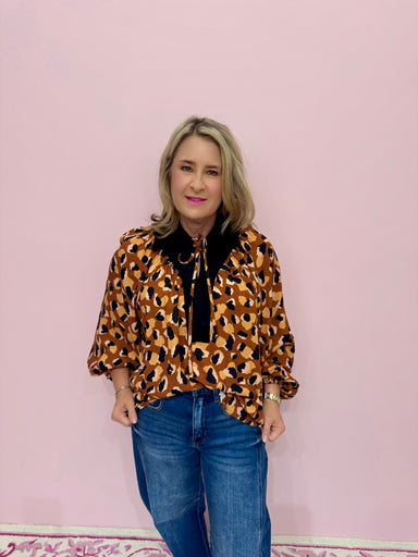 The Arlo Long Sleeve Top by THML features a trendy animal print design paired with a contrasting black collar, creating a chic and eye-catching loo...