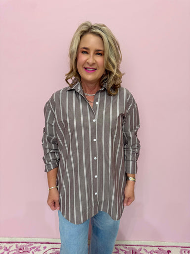 The Seaport Striped Poplin Shirt in Sandalwood by Z Supply is a lightweight, breathable button-up shirt featuring a classic striped pattern and a r...