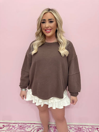 The Becca Top is an oversized ribbed pullover crafted in a rich brown hue, offering both comfort and style. Its relaxed fit and textured fabric pro...