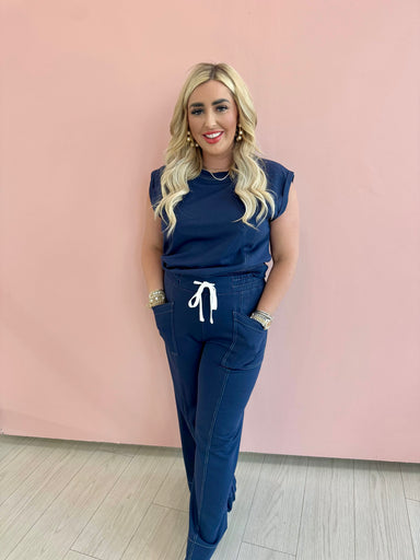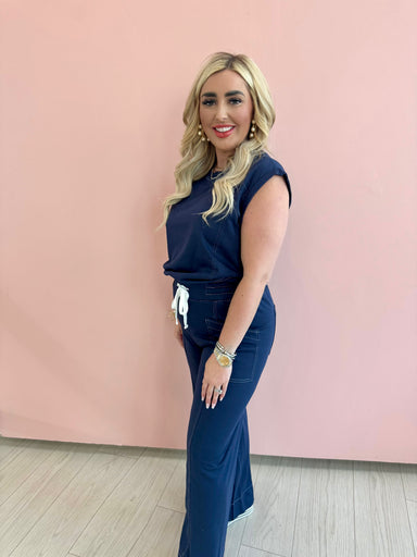 The Erica Set is the perfect addition to your wardrobe for both comfort and style. This navy knit pant and tank set provides a versatile and elegan...