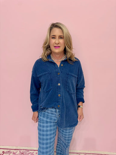 Experience effortless style with the Solace Jersey Denim Top, a butter-soft vest crafted from premium denim blue fabric. This button-up design comb...