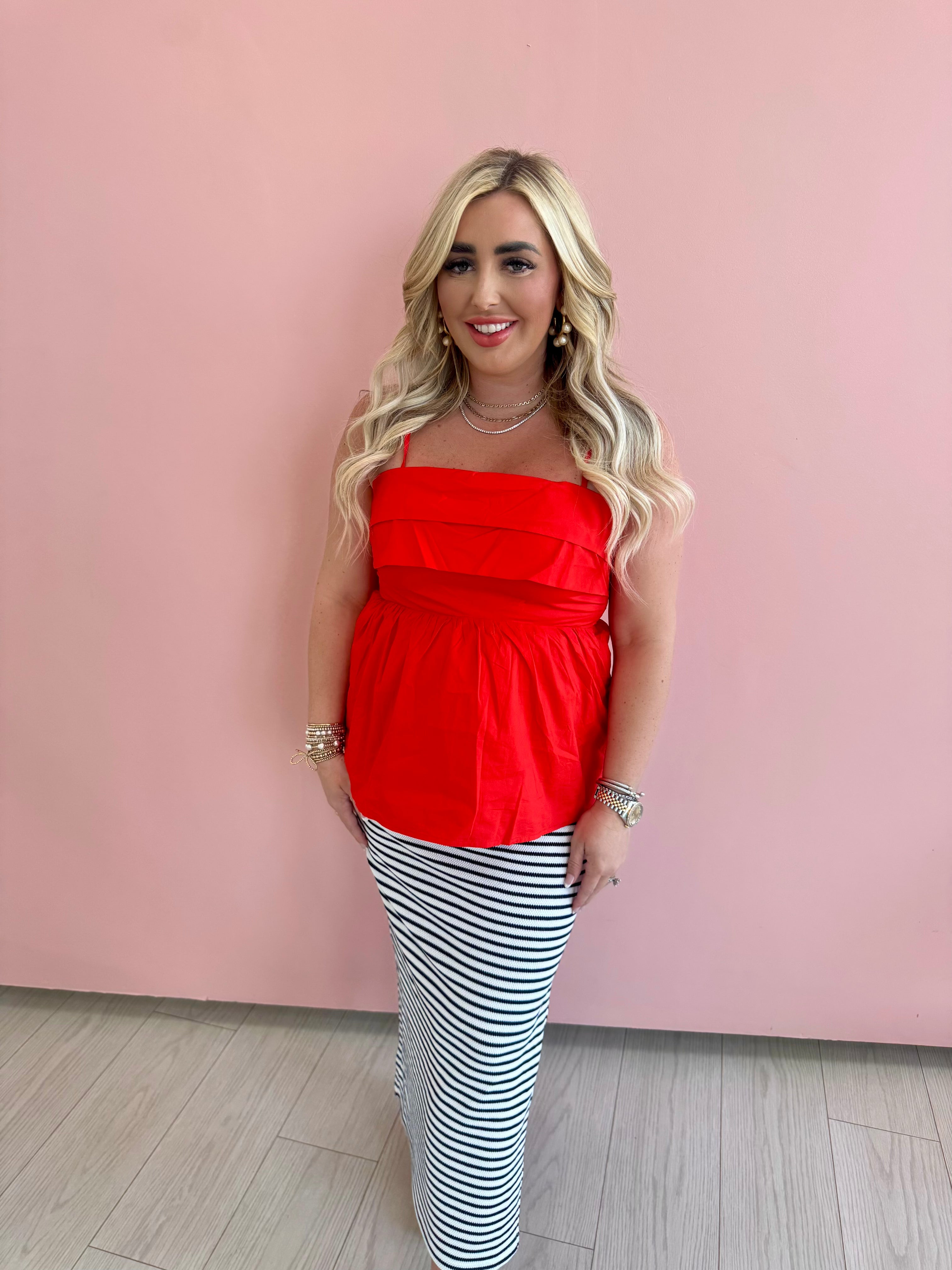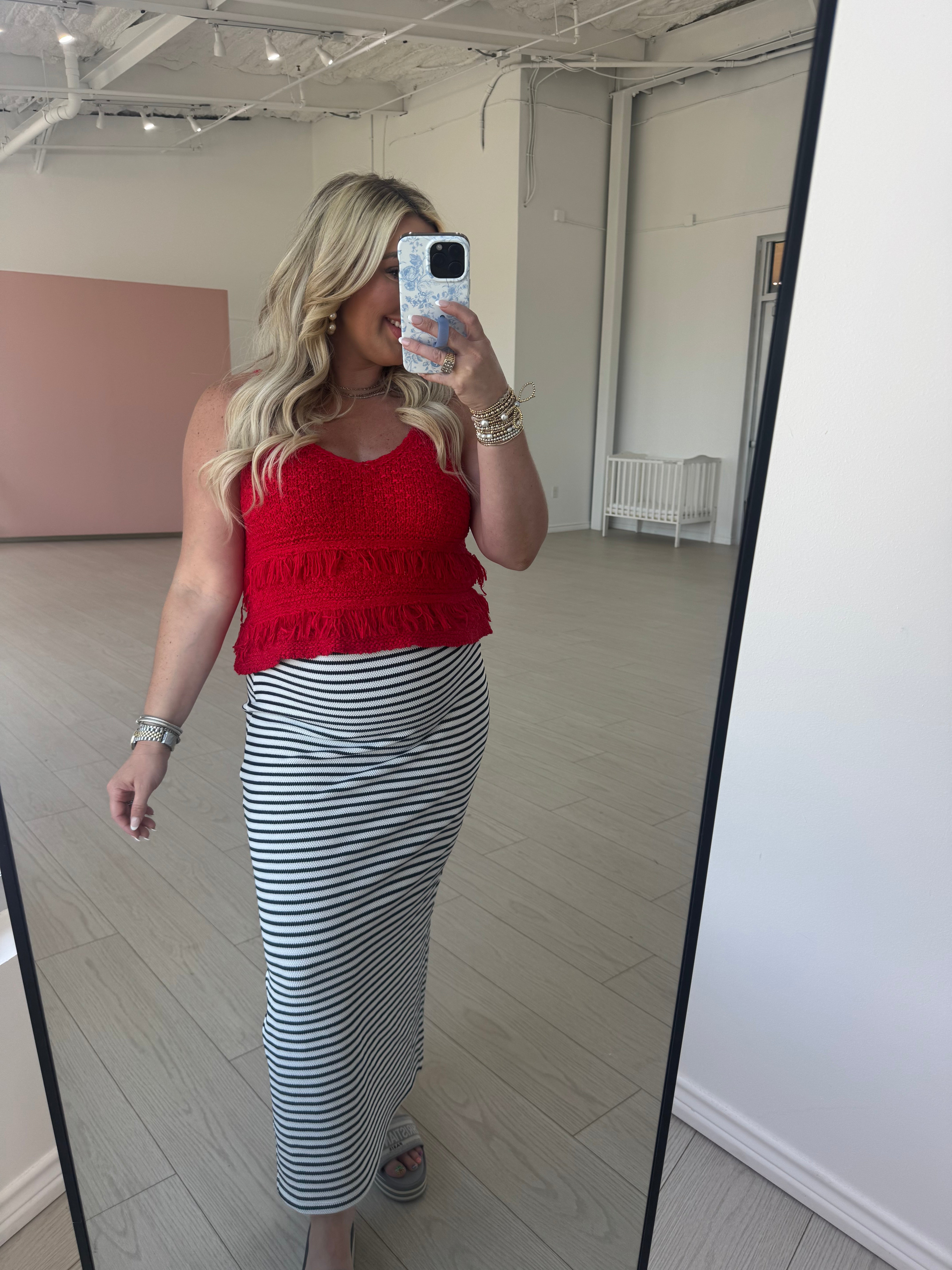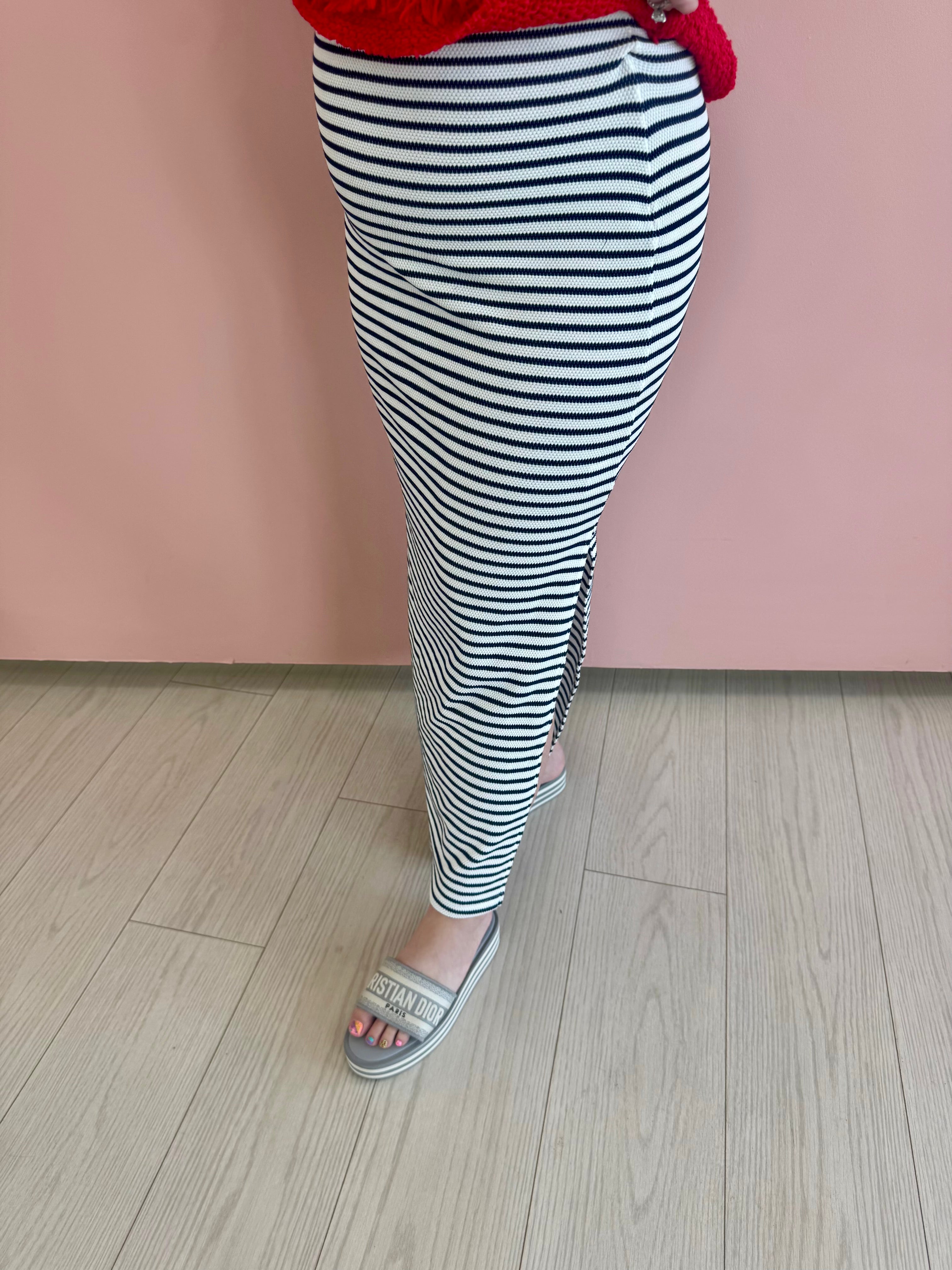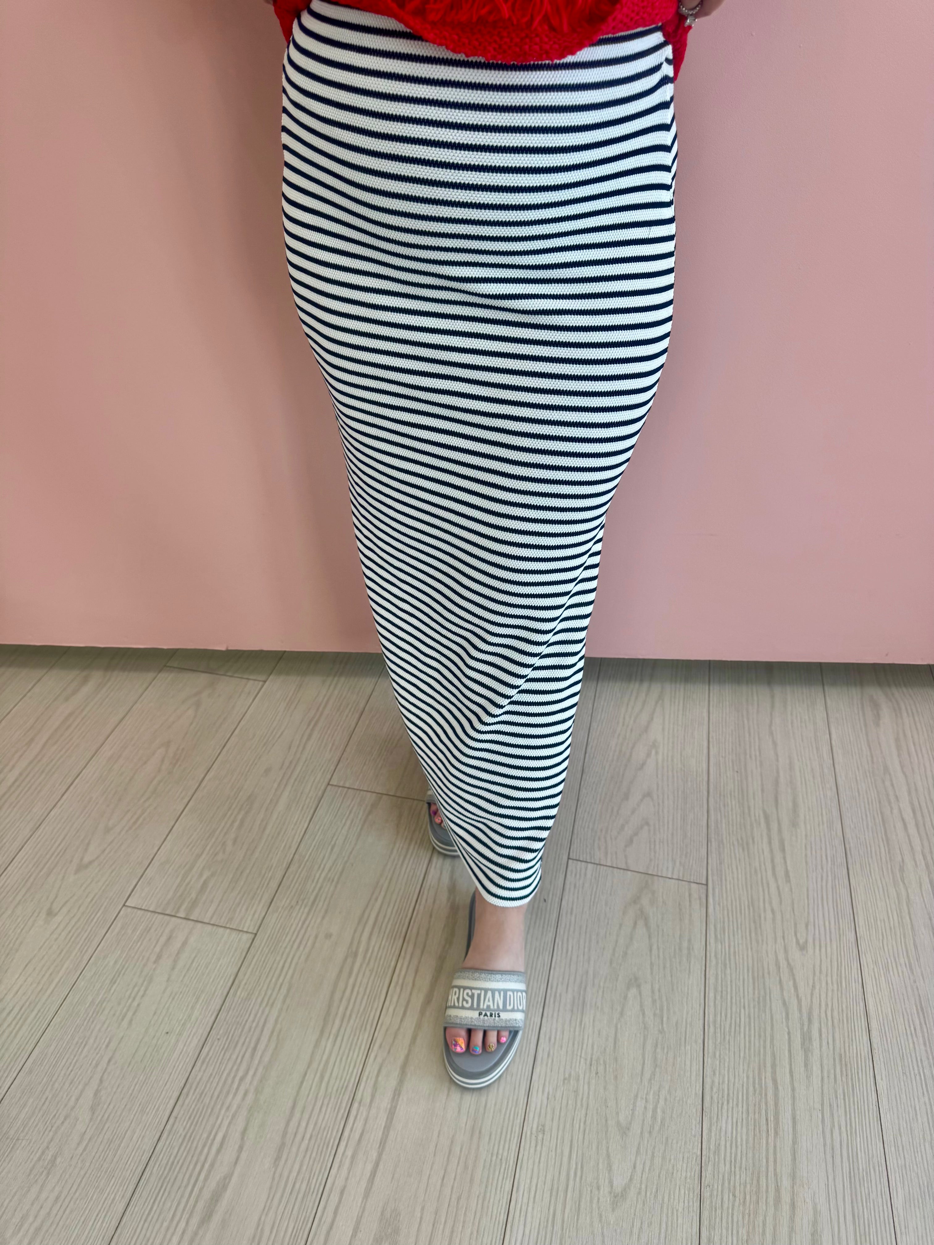 Enhance your wardrobe with the Ainslie Stripe Midi Skirt. This black and white striped skirt adds a classic yet modern touch to any outfit. Made with high-quality material, it offers comfort and durability. Perfect for a day at the office or a night out, this skirt is a versatile and stylish addition to your collection.